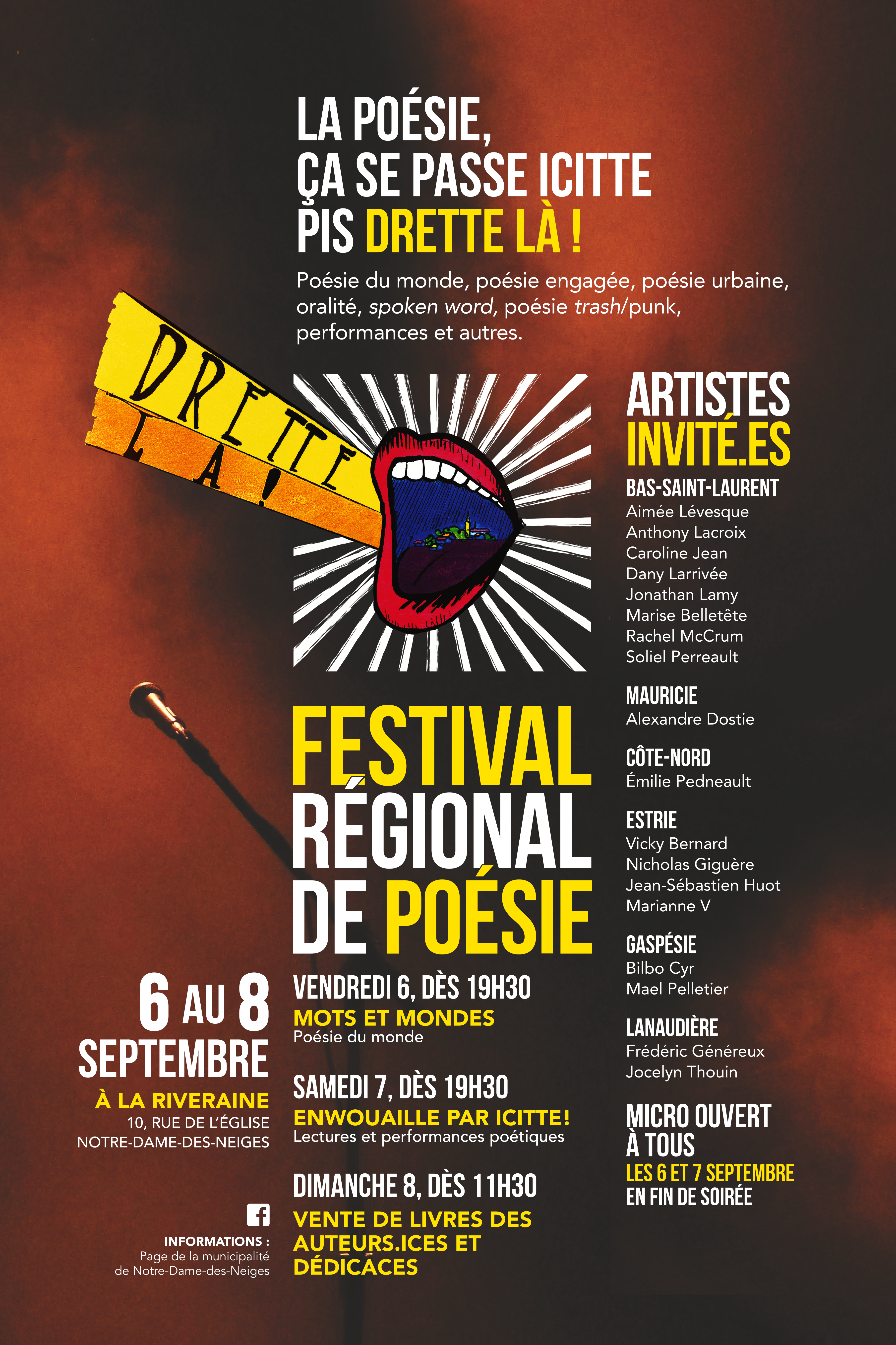 Cette année, à Notre-Dame-des-Neiges, on fête la poésie dans toutes ses formes avec des invités des quatre coins du Québec pour célébrer la poésie et la voix des régions, la couleur et la diversité des accents, la francophonie et la littérature.