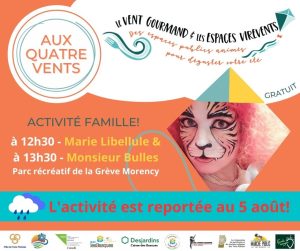 **** REPORTÉ AU 5 AOUT **** – LE VENT GOURMAND ET DES ESPACES VIREVENTS – Aux quatre vents – Marie-Libellule et Monsieur Bulles **** REPORTÉ AU 5 AOUT ****